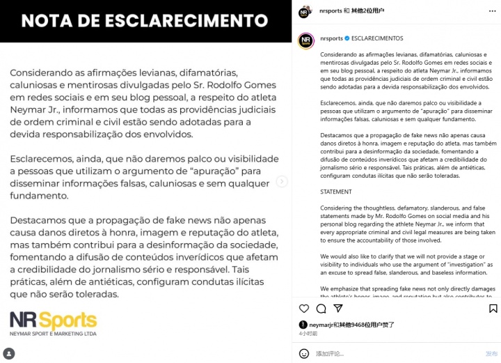 Rodolfo Gomes发布视频后,这些消息就在巴西媒体和推特上疯传,内马尔方面也做出了反应,他的经纪公司NR Sports今早发布声明,表示Rodolfo Gomes散布谣言有损内马尔的形象和名誉,将对其进行起诉。