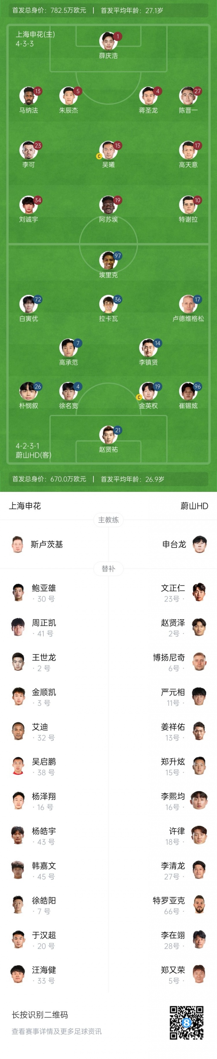 上海申花首发:1-薛庆浩、4-蒋圣龙、5-朱辰杰、13-马纳法、27-陈晋一、10-特谢拉、15-吴曦、17-高天意、23-李可、19-阿苏埃、34-刘诚宇